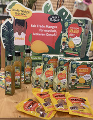 Neu ist das bio Mango-Püree, 500 g, 100 % reine Frucht, kein Zucker, keine Farbstoffe, keine zugesetzten Aromen Für jeden Beutel werden etwa drei süße, reif geerntete Mangos der Sorten Pico und Carabao benötigt. Das Püree wird komplett auf den Philippinen hergestellt, d.h. die Wertschöpfung bleibt im Land.